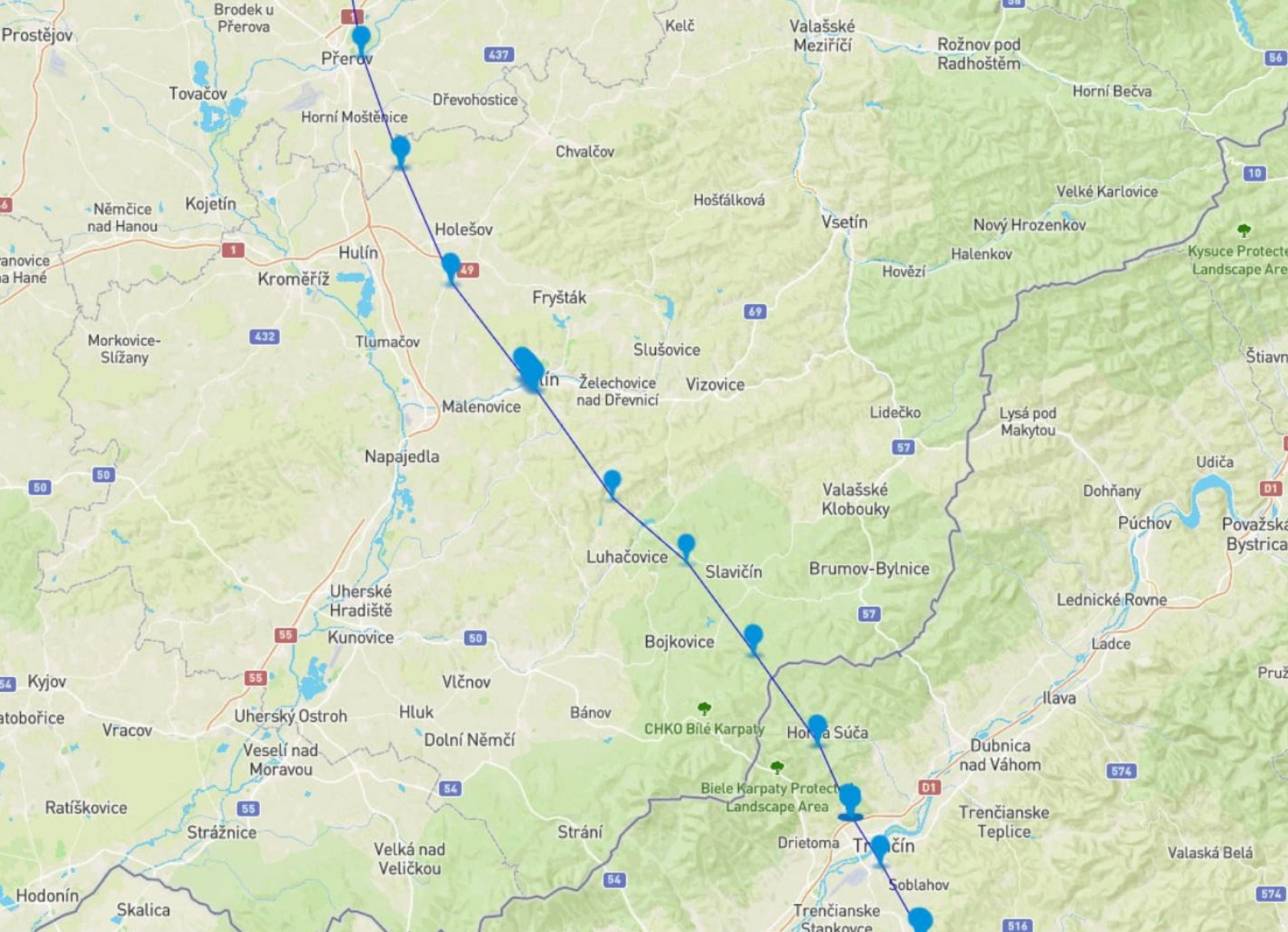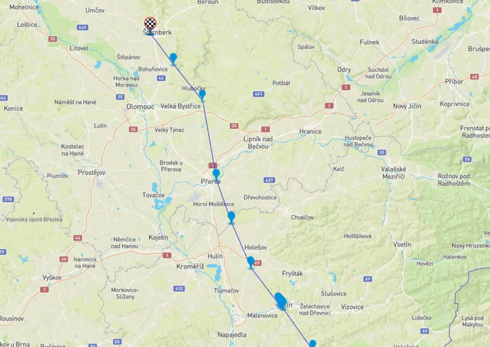Zde pokračoval přes Bojkovice, Luhačovice až do Zlína. Zde začal kolem 18:00 hledat nocleh. Proto je u města Zlín několik bodů těsně vedle sebe. Ráno se vydal na cestu přibližně v 7:15 hodin a pokračoval přes Holešov a Přerov směrem domů. / From there, he continued through Bojkovice and Luhačovice to Zlín. |
